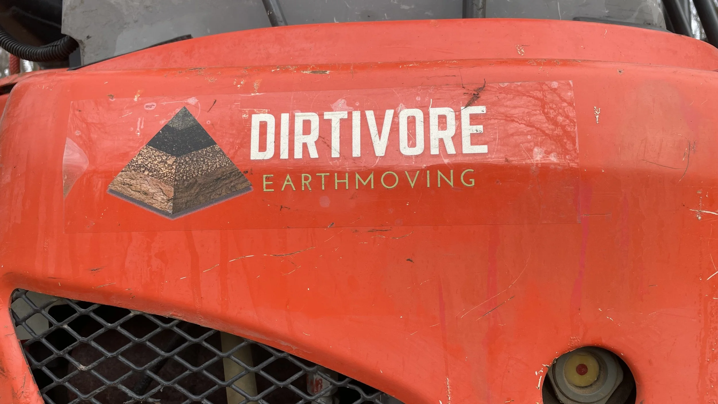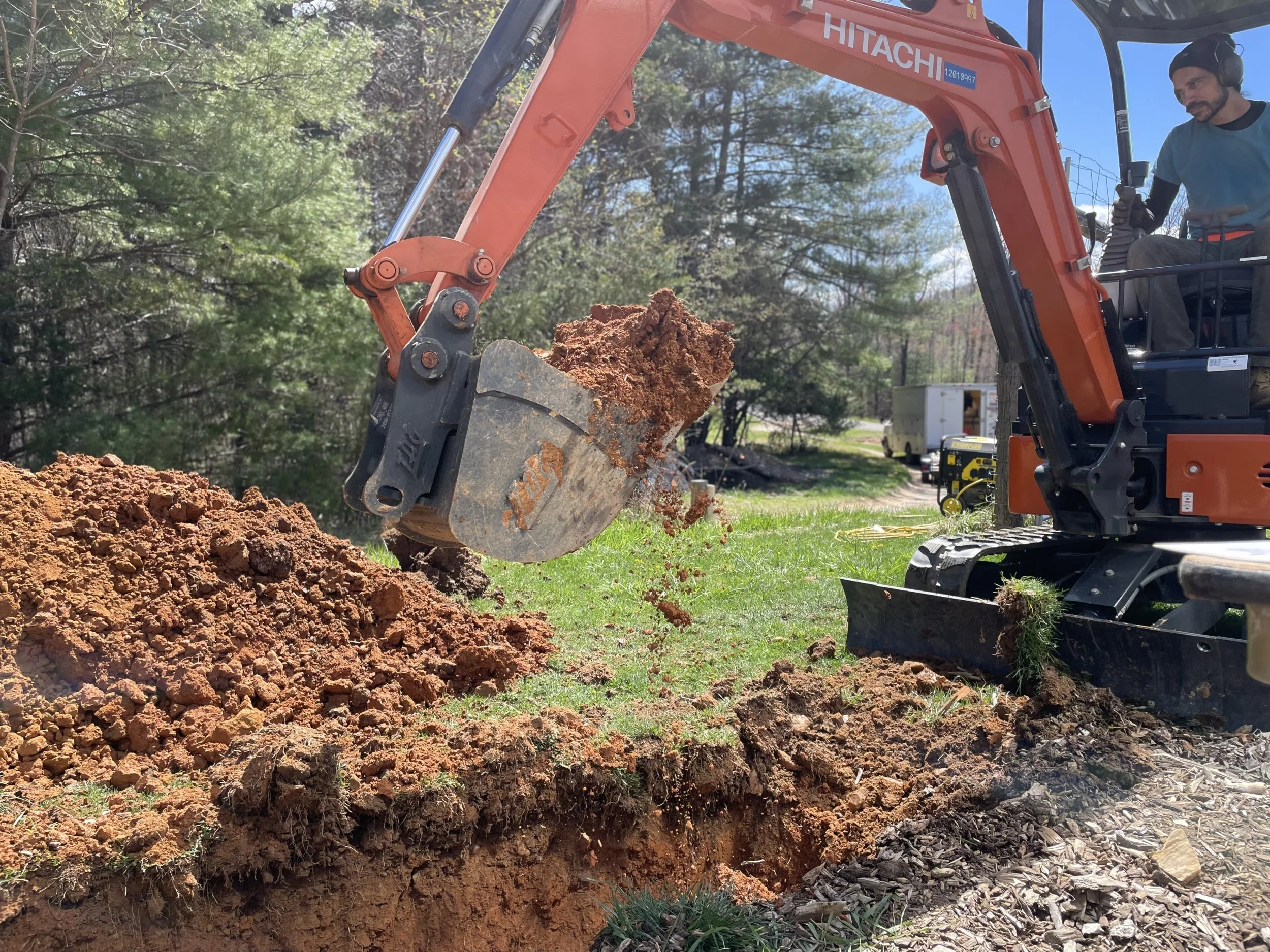 Our small mini excavator is able to move in ways that a skid steer can not allowing us to put dirt right where we want it without damaging surrounding trees or buildings.