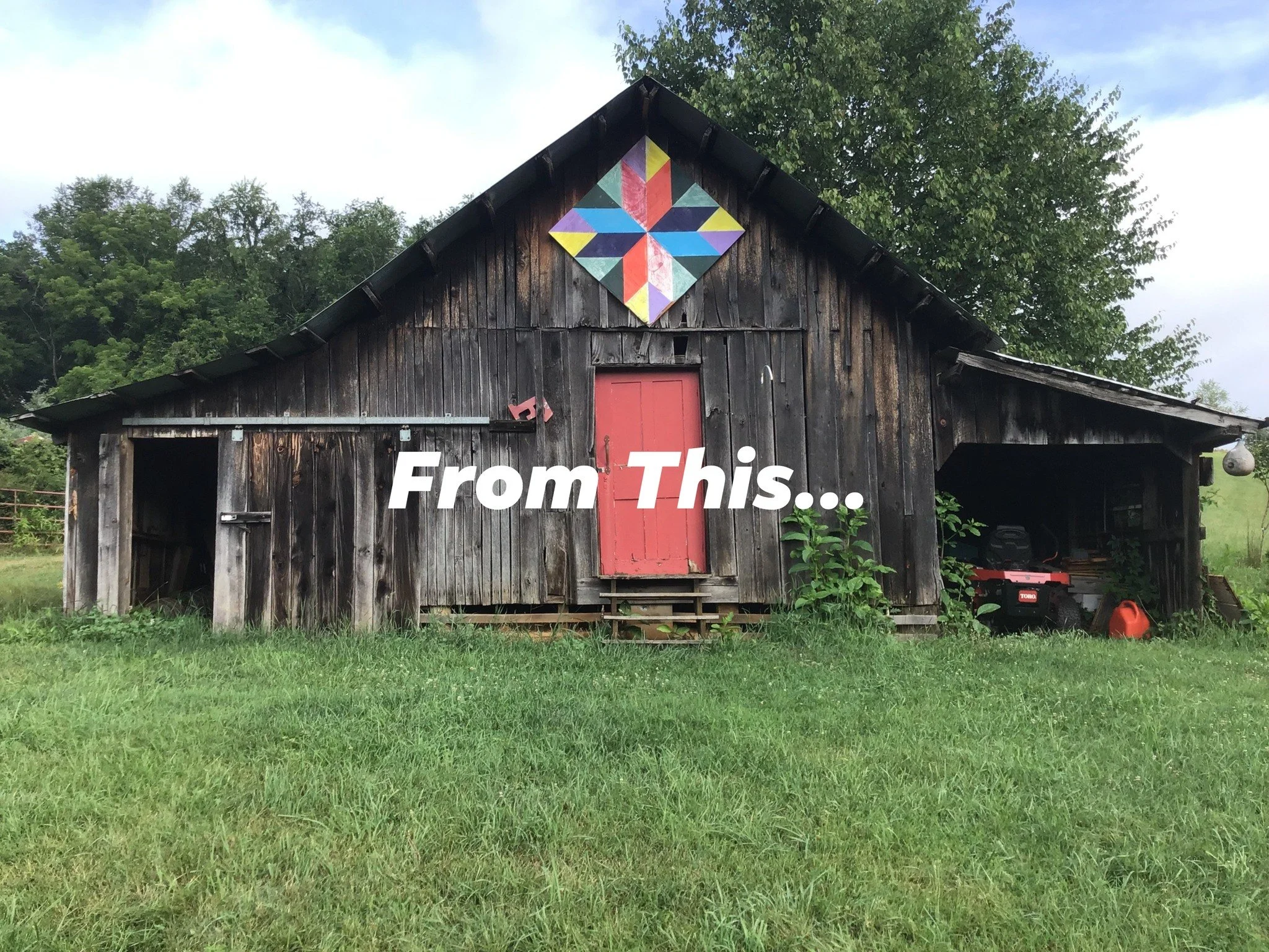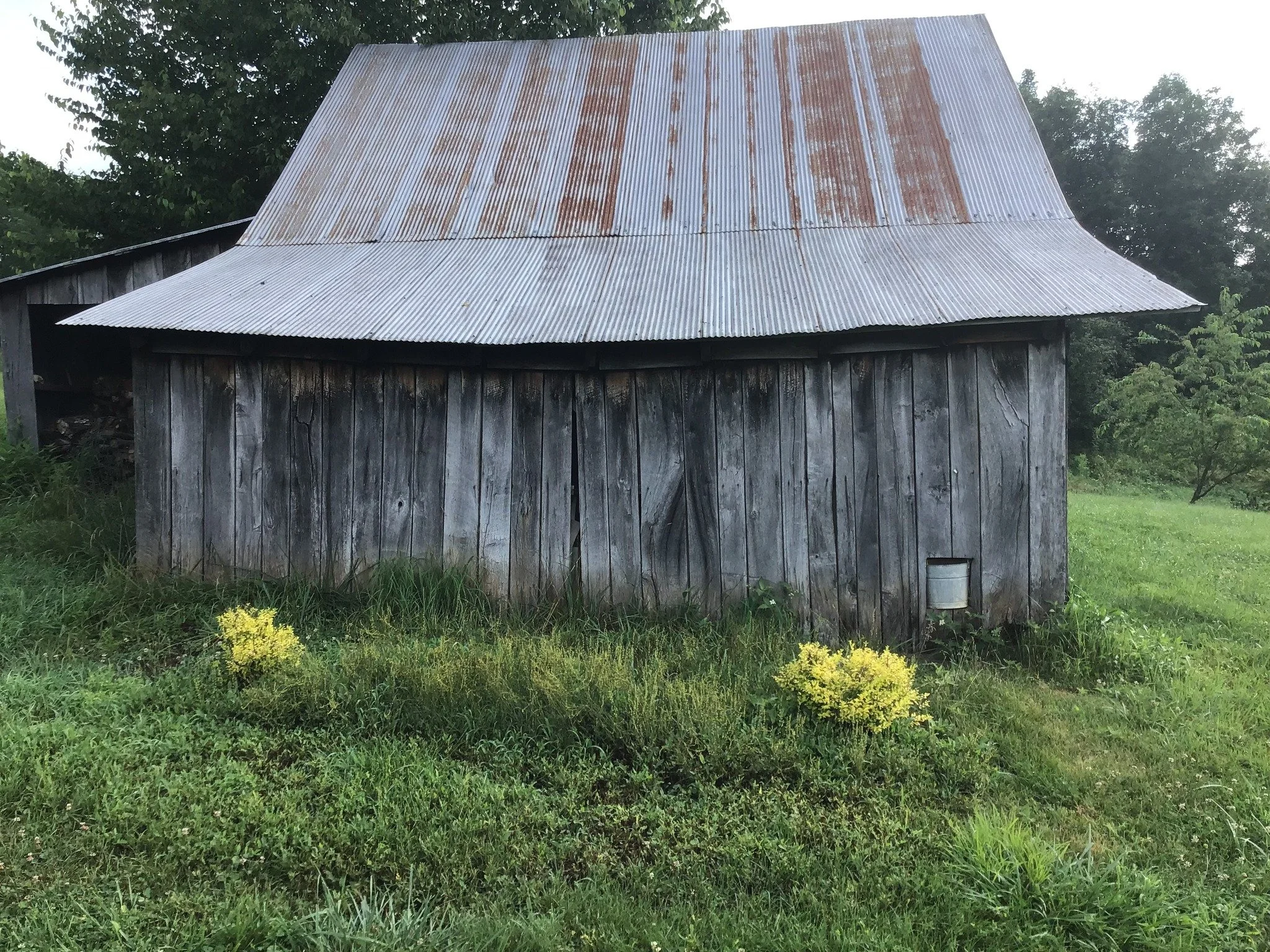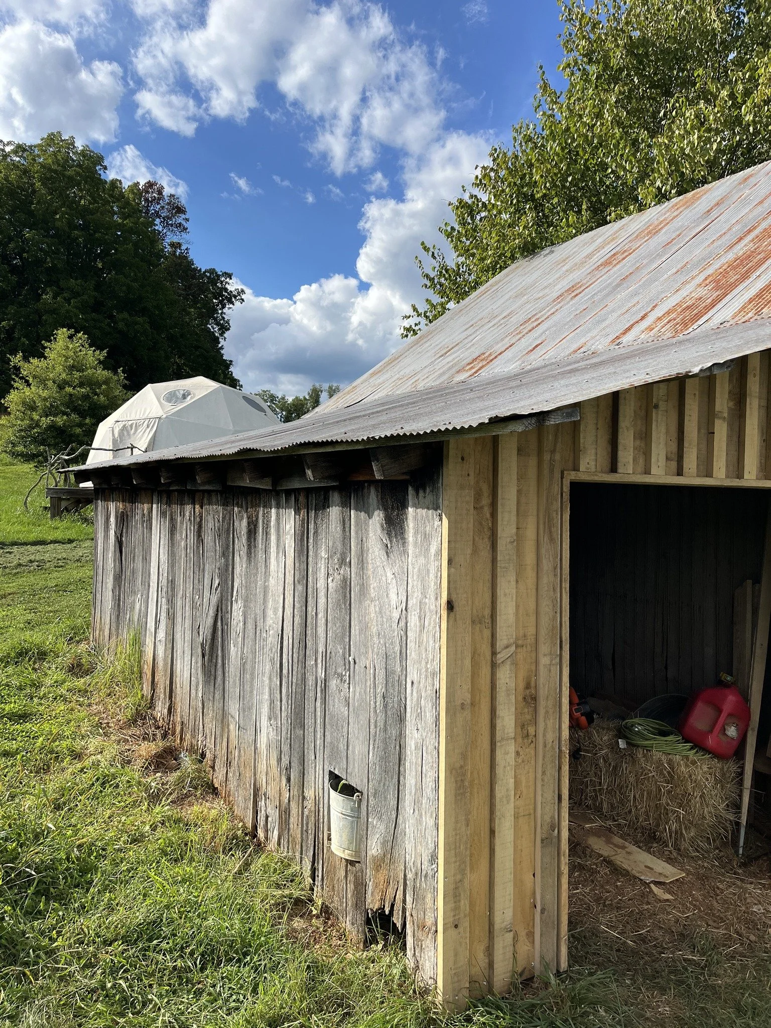 After a little facelift this barn is looking a bit fresher and has a lot less holes going through the siding. We straightened one of the side roofs as well and braced it up to keep it from sinking into the ground.